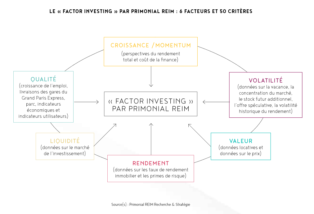 Dans ce contexte, il convient alors de créer une grille d’analyse afin d’identifier les marchés où les prix restent abordables et/ou pouvant bénéficier d’une évolution favorable du marché locatif. S’inspirant du secteur de la finance Praemia REIM Recherche et Stratégie a développé un outil original pour ses stratégies d’investissement : le « factor investing ». Cette approche consiste dans la prise en compte de 6 facteurs que nous avons adaptés au monde de l’immobilier à travers 50 critères.